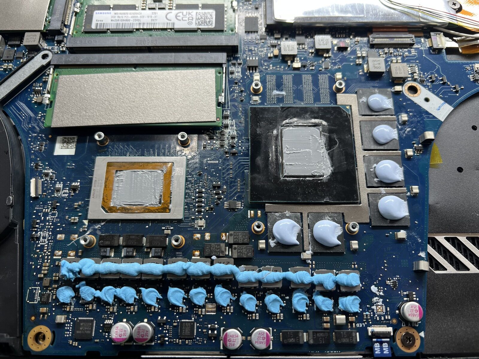 4) После всей подготовки наносятся жидкие термопрокладки, либо в местах, где они толще 2мм нарезаются твердые термопрокладки подходящей толщины со снятием всех замеров перед этим. Также термопрокладки наносятся на видеопамять, если они там требуются (на современных ноутбуках всегда требуются).