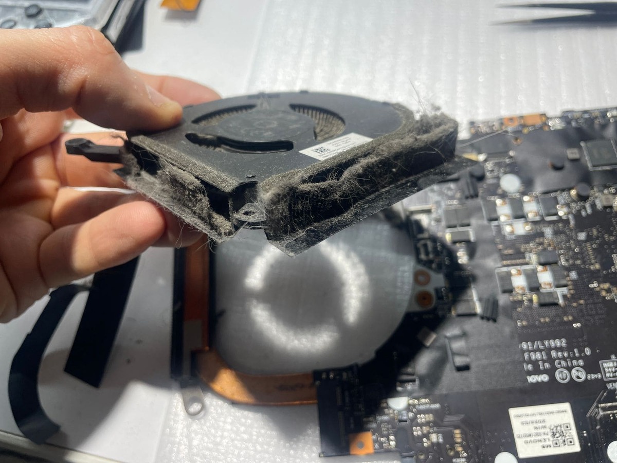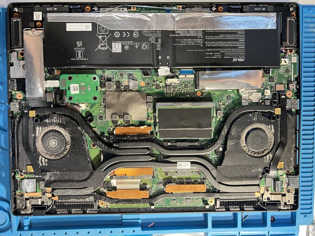 1) Инженер разберет ноутбук и аккуратно снимет систему охлаждения. Тут сразу важно понимать, что ноутбук недостаточно просто «продуть от пыли», подав напор воздуха с наружной стороны. Шапки пыли настолько объёмные и плотные, что даже продувание оставляет обычно 40% мусора по краям и стыкам с вентилятором (смотрите фото).