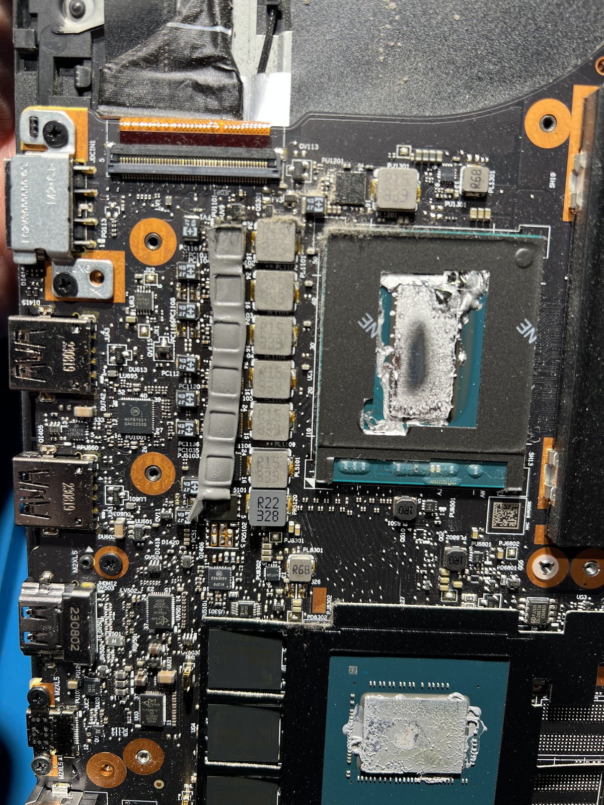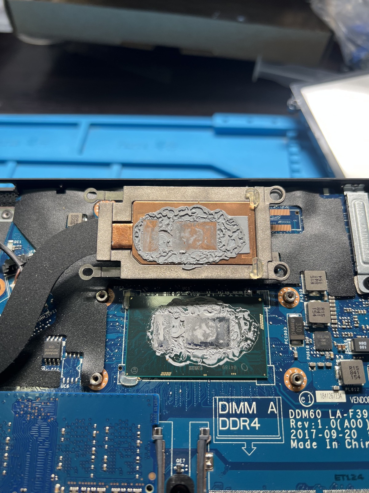 5) на процессор и видеочип наносится термопаста с фазовым переходом. Если ноутбук на жидком металле, то у нас есть отдельная статья про их обслуживание. Мы используем фазовый переход Dowsil TC5888 и Honeywell PTM7950, либо Shin Etsu X23. Если это старый ноутбук с холодным процессором и TDP меньше 20 ватт, то более лучшим решением будет нанести термопасту. Мы используем оригинальную импортную термопасту Arctic. Знайте пожалуйста, всё что продается в Грузии или на OZON и Wildberries является ПОДДЕЛКАМИ и на оригинальные MX4 и MX6 по характеристикам не похоже вообще, мы многократно с коллегами собирали стенды и испытывали разные термопасты.