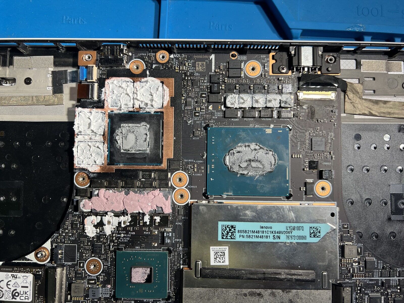 Игровые ноутбуки имеют более сложную систему охлаждения, больше тепловыделение и дополнительные зоны охлаждения (VRM, видеопамять). Их обслуживание требует замены всех термоинтерфейсов и более точной настройки теплоотвода, в отличие от базовых офисных моделей.